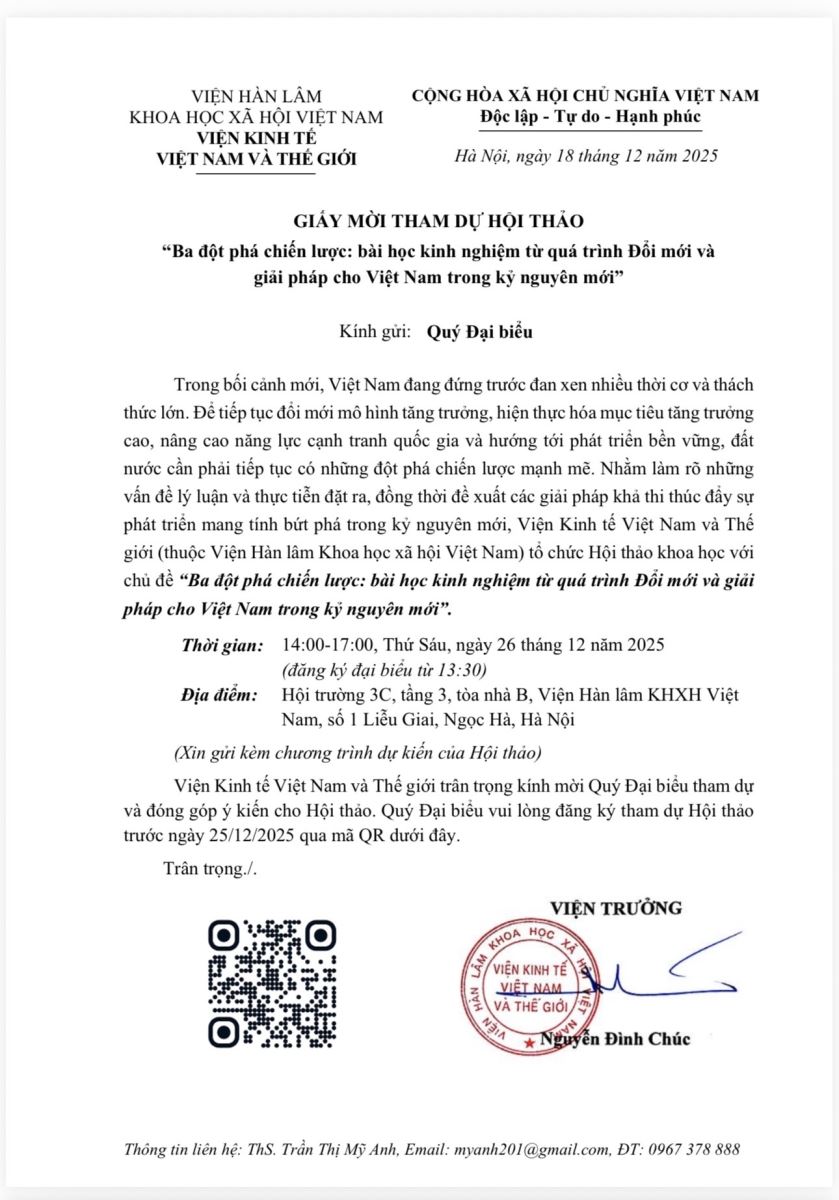 GIẤY MỜI THAM DỰ HỘI THẢO “Ba đột phá chiến lược: bài học kinh nghiệm từ quá trình Đổi mới và giải pháp cho Việt Nam trong kỷ nguyên mới”