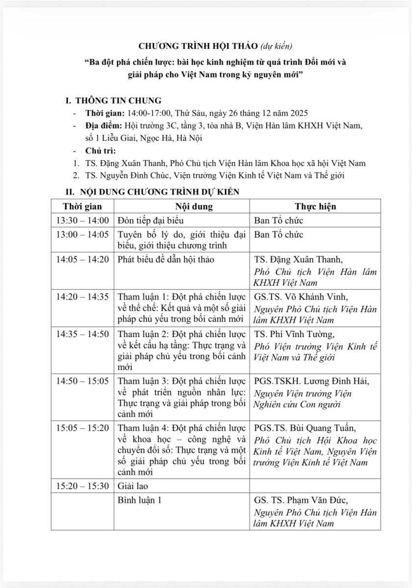 Kính mời quý Đại biểu quan tâm tham dự hội thảo: "Ba đột phá chiến lược: bài học kinh nghiệm từ quá trình Đổi mới và giải pháp cho Việt Nam trong kỷ nguyên mới"