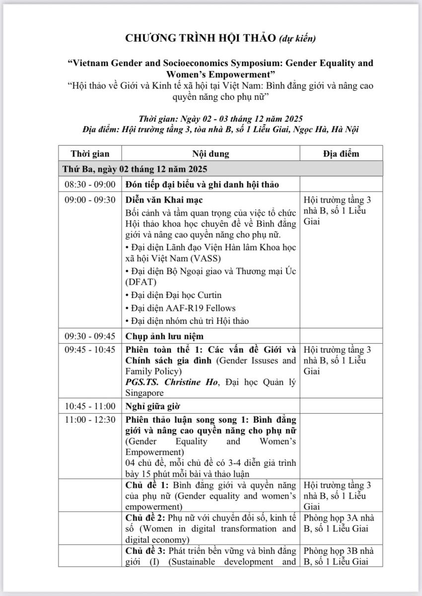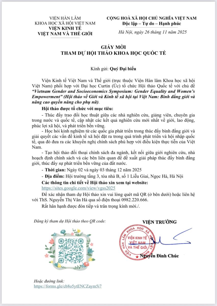 - THƯ MỜI VIẾT BÀI HỘI THẢO KHOA HỌC QUỐC TẾ: “Vietnam Gender and Socioeconomics Symposium: Gender Equality and Women’s Empowerment” (“Hội thảo về giới và kinh tế xã hội tại Việt Nam: Bình đẳng giới và nâng cao quyền năng cho phụ nữ”). (21/11/2025 1:29:07 CH)