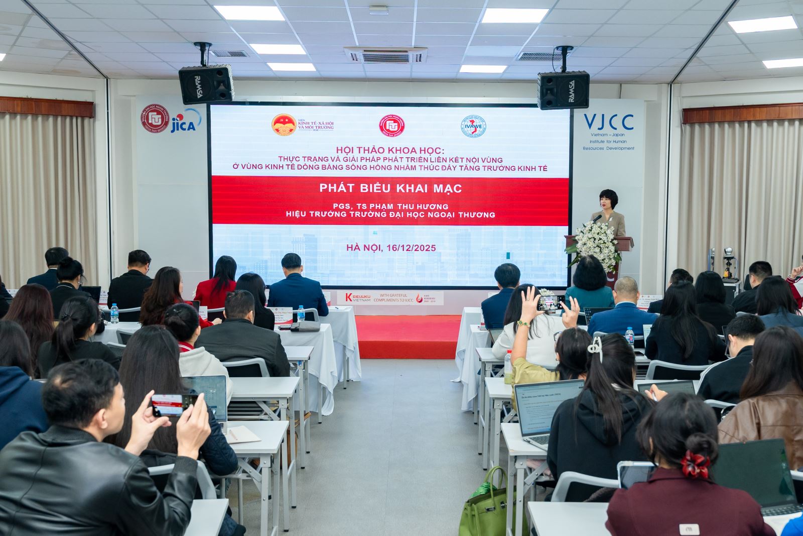 Ngày 16/12/2025, tại Trụ sở chính Hà Nội, Trường Đại học Ngoại thương đã phối hợp cùng Viện Kinh tế - Xã hội – Môi trường (Học viện Chính trị quốc gia Hồ Chí Minh) và Viện Kinh tế Việt Nam và Thế giới tổ chức Hội thảo khoa học với chủ đề “Thực trạng và giải pháp phát triển liên kết nội vùng ở Vùng kinh tế đồng bằng sông Hồng nhằm thúc đẩy tăng trưởng kinh tế”