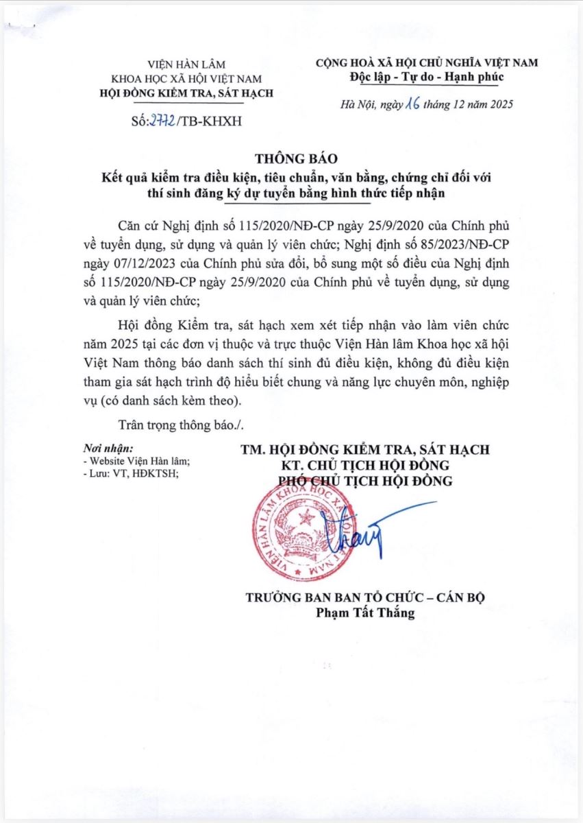 Thông báo số 2772/TB-KHXH ngày 16/12/2025 của Hội đồng Kiểm tra sát hạch Viện Hàn lâm Khoa học xã hội Việt Nam