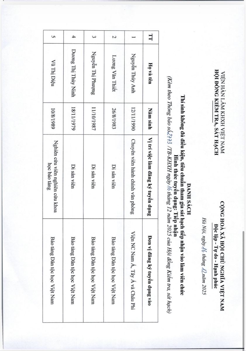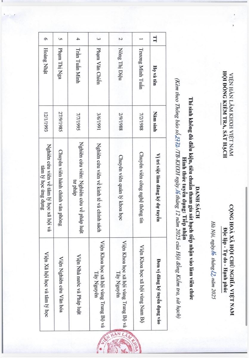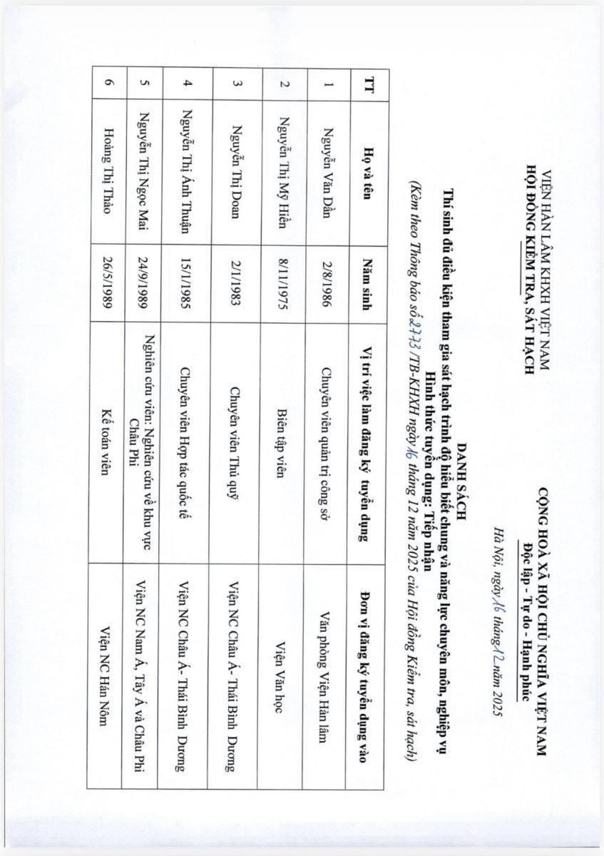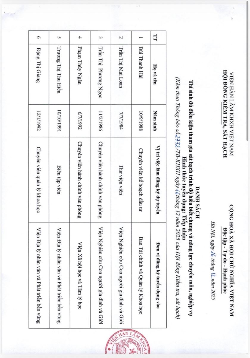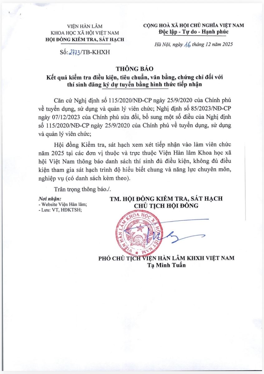 Thông báo số 2773/TB-KHXH ngày 16/12/2025 của Hội đồng Kiểm tra sát hạch Viện Hàn lâm Khoa học xã hội Việt Nam:
