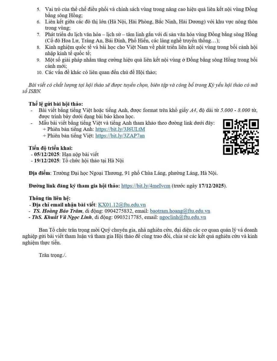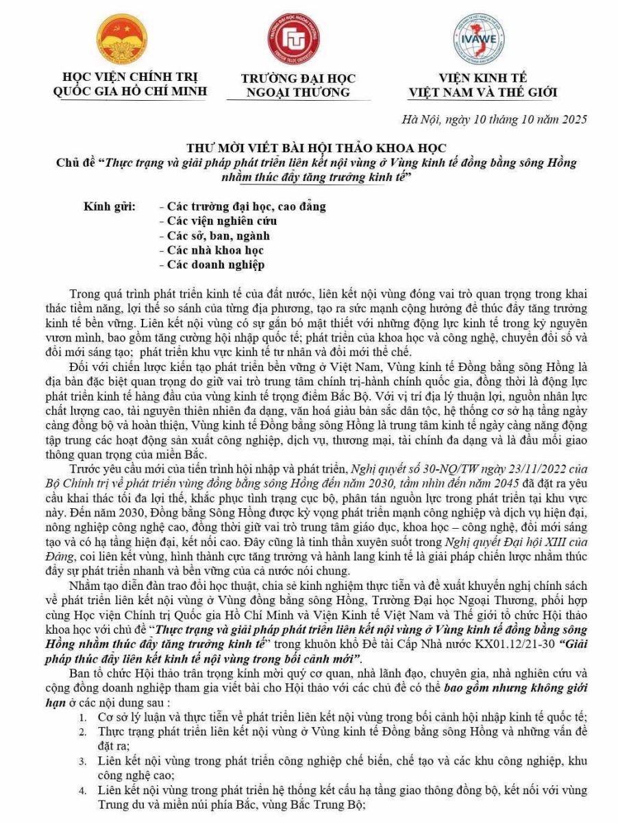 THƯ MỜI VIẾT BÀI HỘI THẢO KHOA HỌC: “Thực trạng và giải pháp phát triển liên kết nội vùng ở Vùng kinh tế đồng bằng sông Hồng nhằm thúc đẩy tăng trưởng kinh tế”