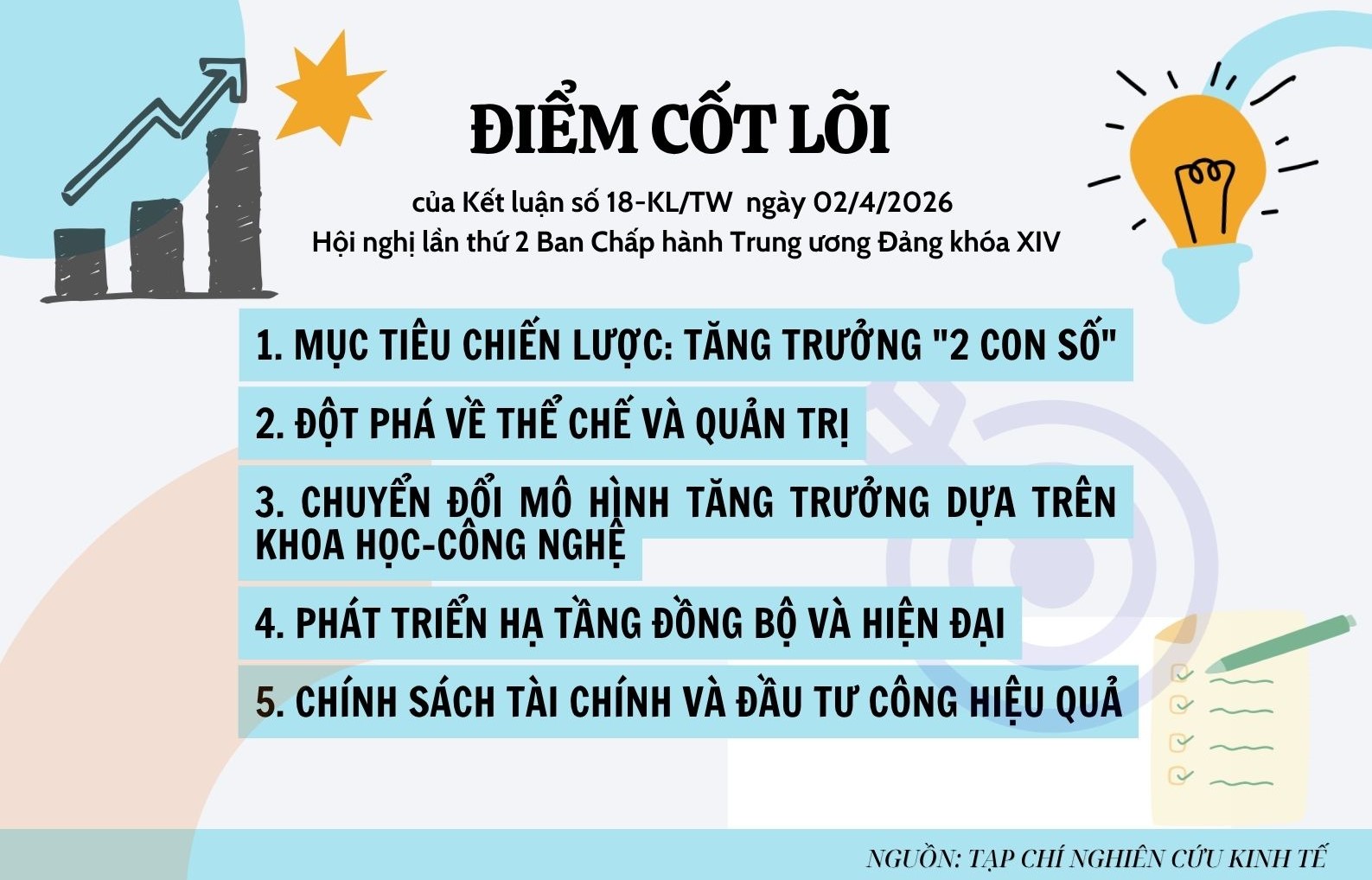 Tạp chí Nghiên cứu Kinh tế trân trọng gửi đến toàn thể Quý Tác giả, Cộng tác viên và Bạn đọc tham khảo và trích dẫn những điểm cốt lõi của Kết luận số 18-KL/TW Hội nghị lần thứ 2 Ban Chấp hành Trung ương Đảng khoá XIV tập trung vào việc hoạch định chiến lược phát triển đất nước giai đoạn 2026-2030