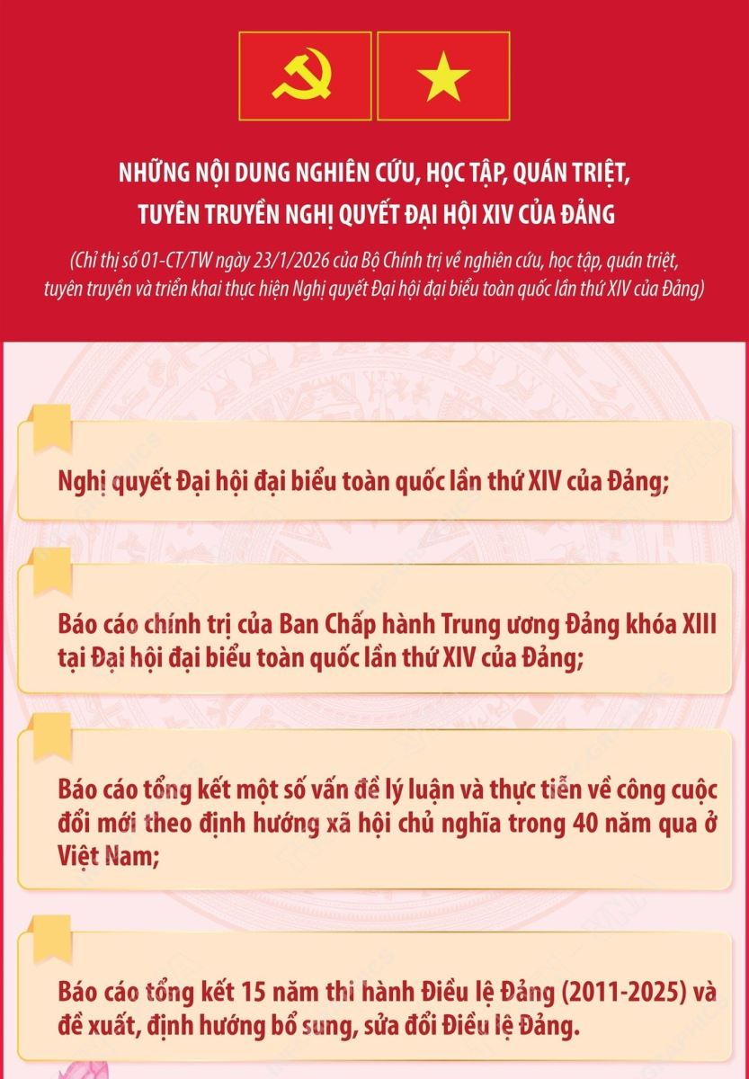 Trong đó: Xác định việc tổ chức nghiên cứu, học tập, quán triệt và triển khai thực hiện Nghị quyết Đại hội XIV là một trong những nhiệm vụ trọng tâm của năm 2026 và cả nhiệm kỳ, phải được thực hiện nghiêm túc, bài bản, khoa học; đây là đợt sinh hoạt chính trị sâu rộng để mỗi cán bộ, đảng viên nắm vững và thực hiện đúng đắn, sáng tạo, hiệu quả Nghị quyết, tạo sự chuyển biến rõ rệt về nhận thức, thống nhất ý chí và hành động trong toàn Đảng, sự đồng thuận của Nhân dân, khơi dậy và phát huy truyền thống yêu nước, ý chí tự lực, tự cường, sức mạnh đại đoàn kết toàn dân tộc trong công cuộc xây dựng, phát triển đất nước và bảo vệ Tổ quốc.